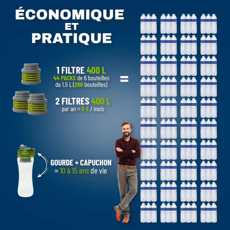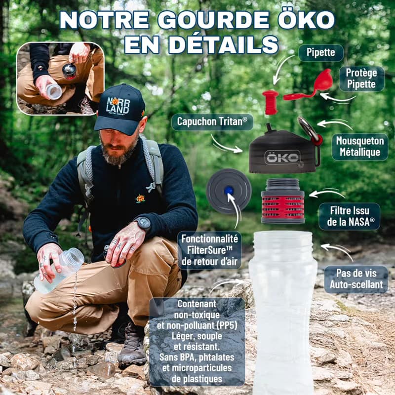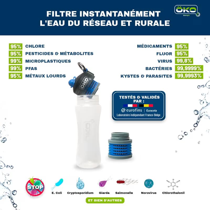 The ÖKO water bottle filter is an innovative solution for purifying the water you drink every day. Equipped with a patented filter based on technology developed by NASA in 2002, it effectively eliminates a wide range of contaminants present in tap water or water from natural sources.
