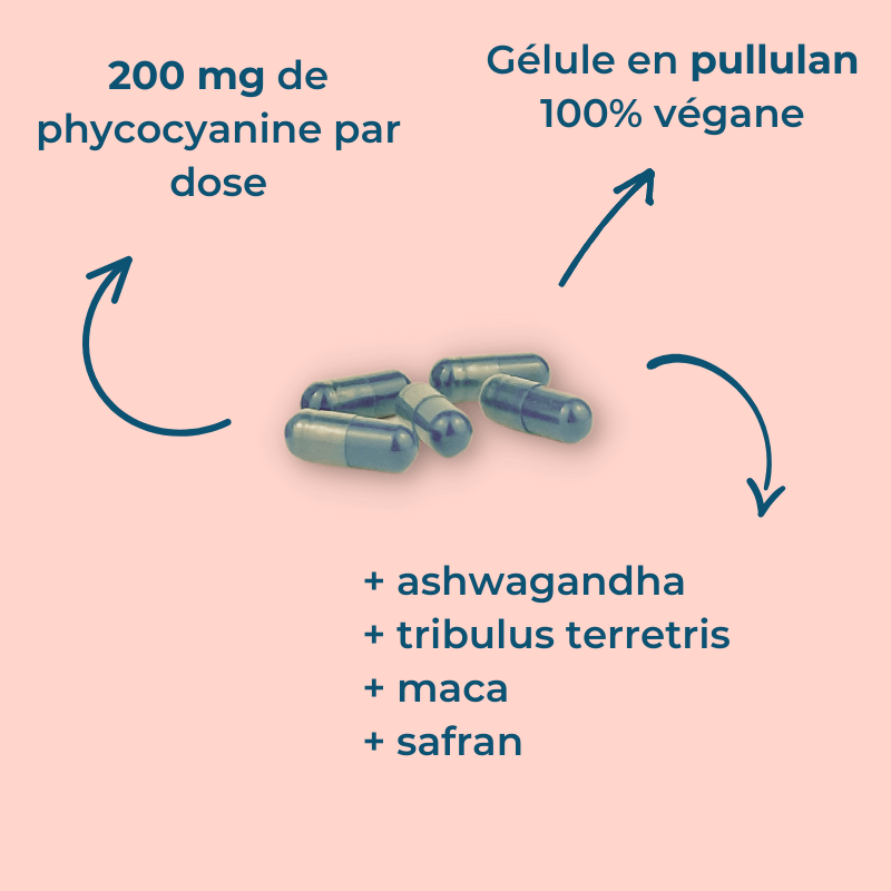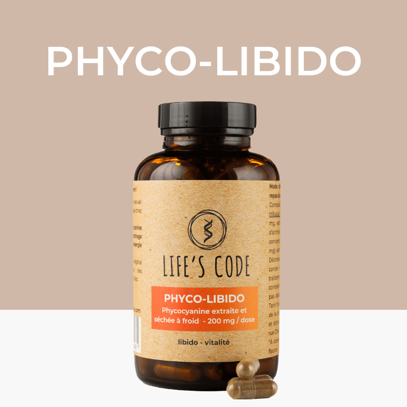 Thanks to its combination of phycocyanin, tribulus, maca, saffron and ashwagandha, Phyco-Libido stimulates sexual desire and performance, improves fertility, supports vitality and energy, while promoting relaxation, emotional balance and resistance to stress. Its benefits are tailored to the specific needs of both men and women