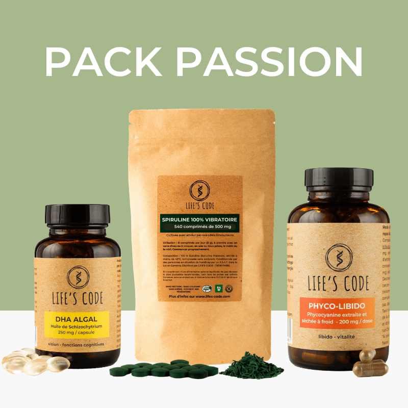 The PASSION Pack is a complete solution to care for your vitality and well-being, support libido and fertility, and accompany women through the menopause. Composed of Phyco-Libido, spirulina and Algal DHA.This pack combines essential active ingredients such as phycocyanin, maca, tribulus, ashwagandha, saffron and omega-3.