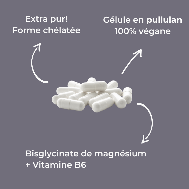 El bisglicinato de magnesio está compuesto por magnesio y glicina, un aminoácido que ofrece una forma liposoluble mejor asimilada por la pared intestinal. El magnesio interviene en la homeostasis y en el buen funcionamiento del sistema nervioso. Este oligoelemento esencial interviene en más de 300 reacciones enzimáticas del organismo.