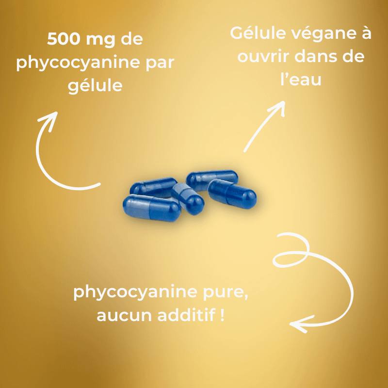Consejo: Abra las cápsulas y vierta el contenido en agua antes de tomarlas, para aprovechar el magnífico color de la ficocianina y optimizar su absorción.