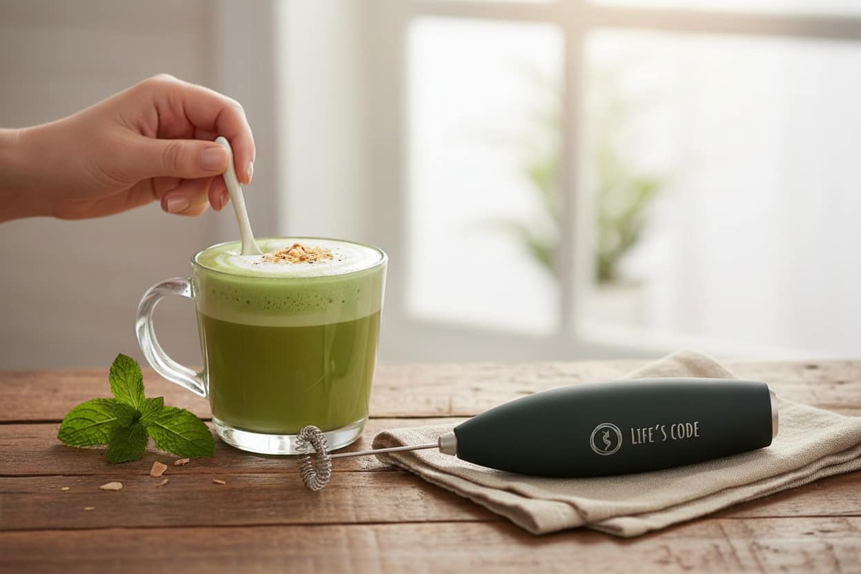 Conçu pour mélanger efficacement et créer une mousse légère et onctueuse, il transforme instantanément vos boissons chaudes (lattés, chocolats, matcha, chaï…) en potions santé riches en collagène (ou autres superaliments) gourmandes et aériennes.